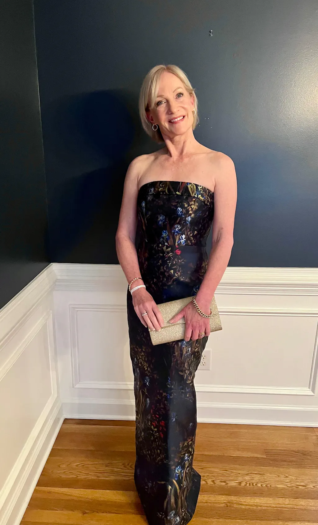 A moody floral moment in custom-printed mikado, grounded in rich navy and layered with painted irises and wild blooms. A bold pick for galas and black-tie weddings.