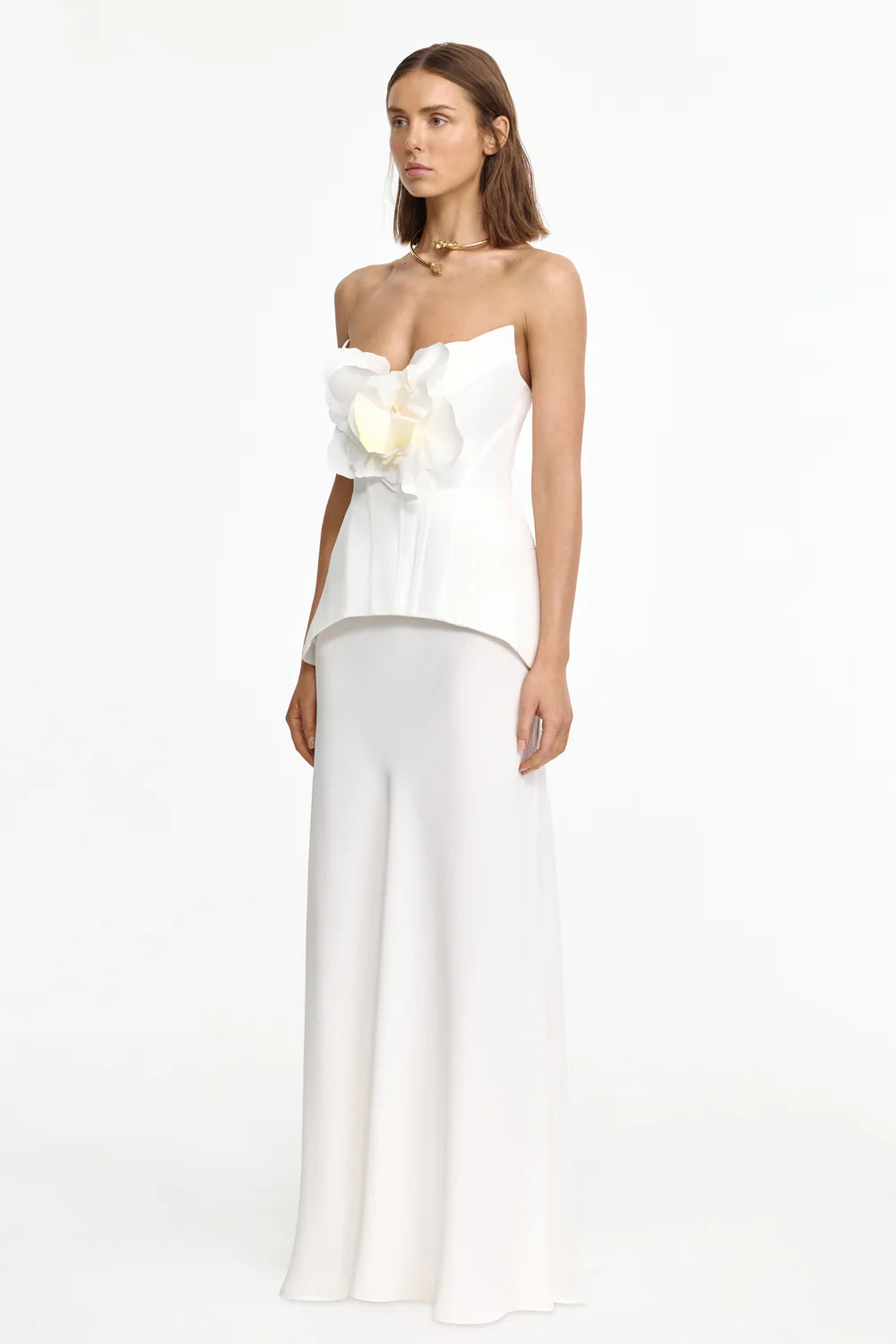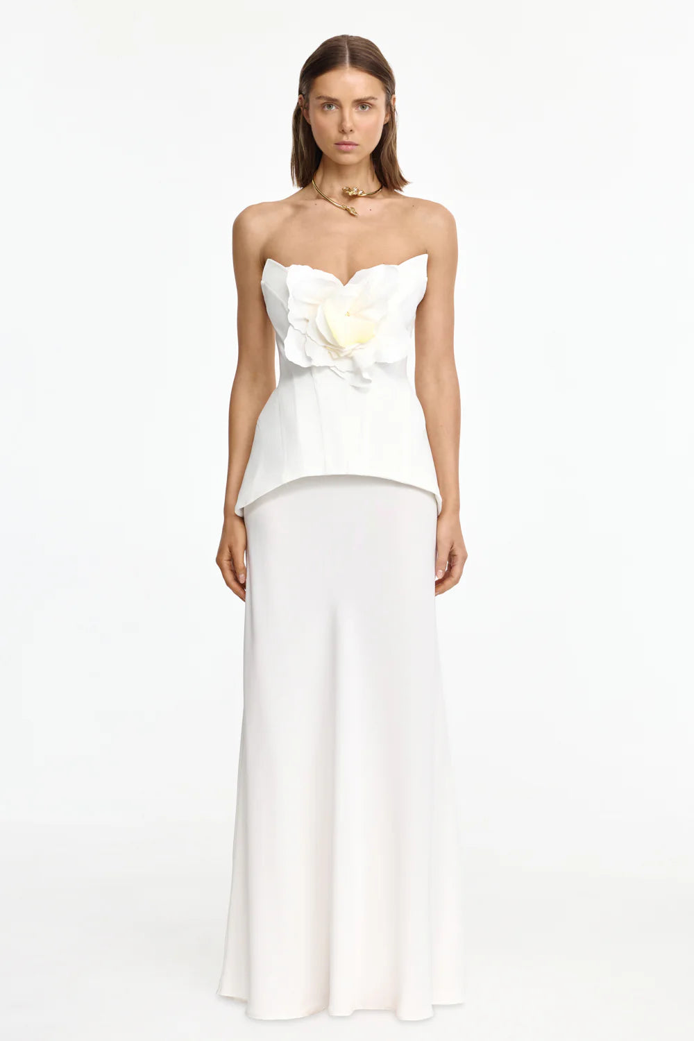 A vision of sculptural artistry, the Bankson Maxi Dress in Ivory is defined by a fitted bodice and bold, layered floral appliqué. Crafted from smooth, structured crepe, this maxi silhouette leans into couture-inspired event dressing with its three-dimensional flower detail. Perfect for formal occasions, it offers an unexpected approach to modern femininity.