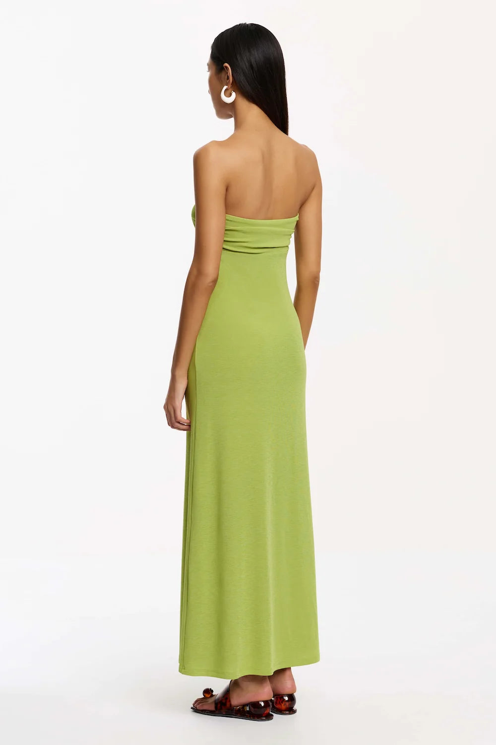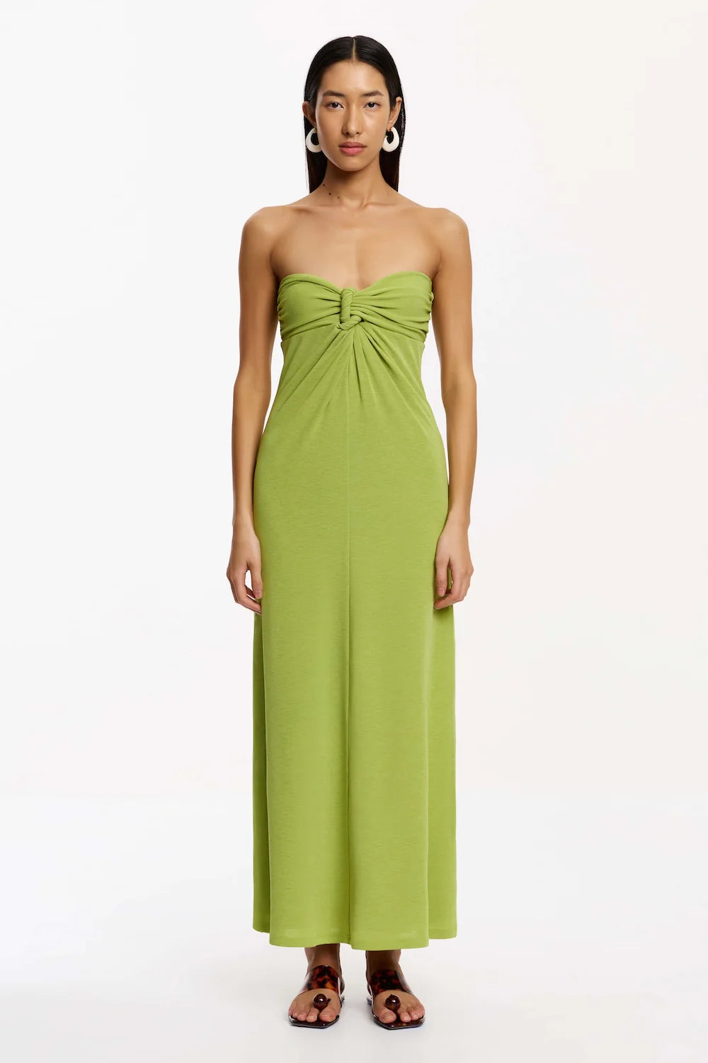 The Carrey Strapless Maxi Dress in Apple showcases a sculptural silhouette, defined by its twisted front knot detail and gathered back bodice. Crafted from textured jersey knit in a vivid green hue, this fully lined, pull-on design fuses modern styling with resort inspired ease‚ an ideal choice for summer days and nights.