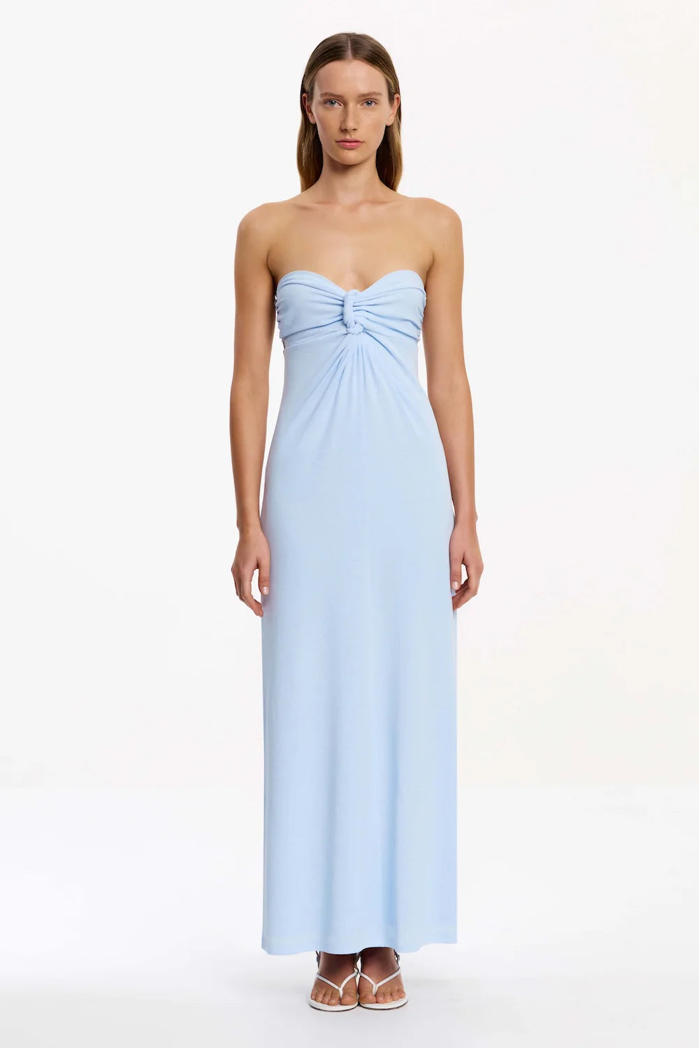 The Carrey Strapless Maxi Dress in Powder showcases a sculptural silhouette, defined by its twisted front knot detail and gathered back bodice. Crafted from textured jersey knit in a vivid blue hue, this fully lined, pull-on design fuses modern styling with resort inspired ease‚ an ideal choice for summer days and nights.
