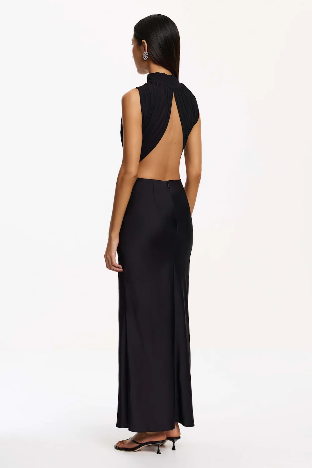 The London Gown in Black unites sculptural pleating with liquid satin for a striking evening silhouette. A pleated jersey bodice‚ open at the back and artfully twisted to the front waist‚ creates architectural dimension, while the bias-cut satin skirt drapes with refined elegance. Perfect for formal events, this piece is fully lined for seamless comfort.