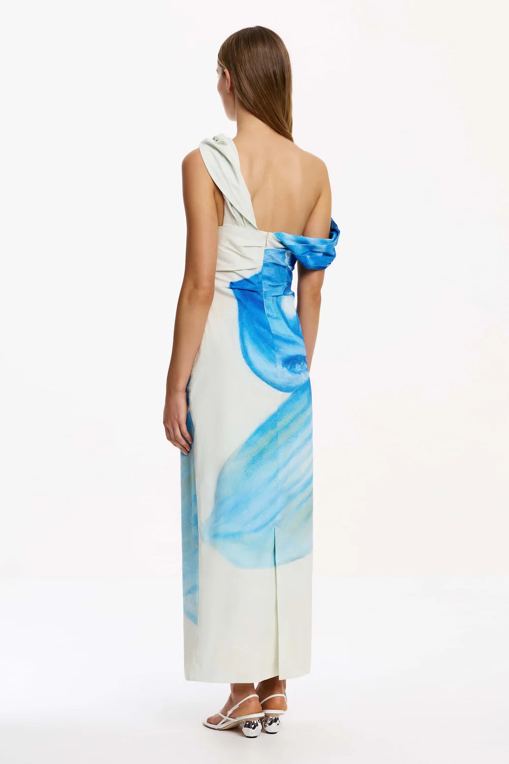 The Olea Dress in Hyperbloom captivates with an architectural silhouette and a bold placement print. Defined by an asymmetrical neckline, the dress features a sculptural twisted strap at the left shoulder and a dramatic off-shoulder drape on the right. Precision tucks at the waist and hip create a refined, contoured finish, perfect for formal events or elevated occasions.