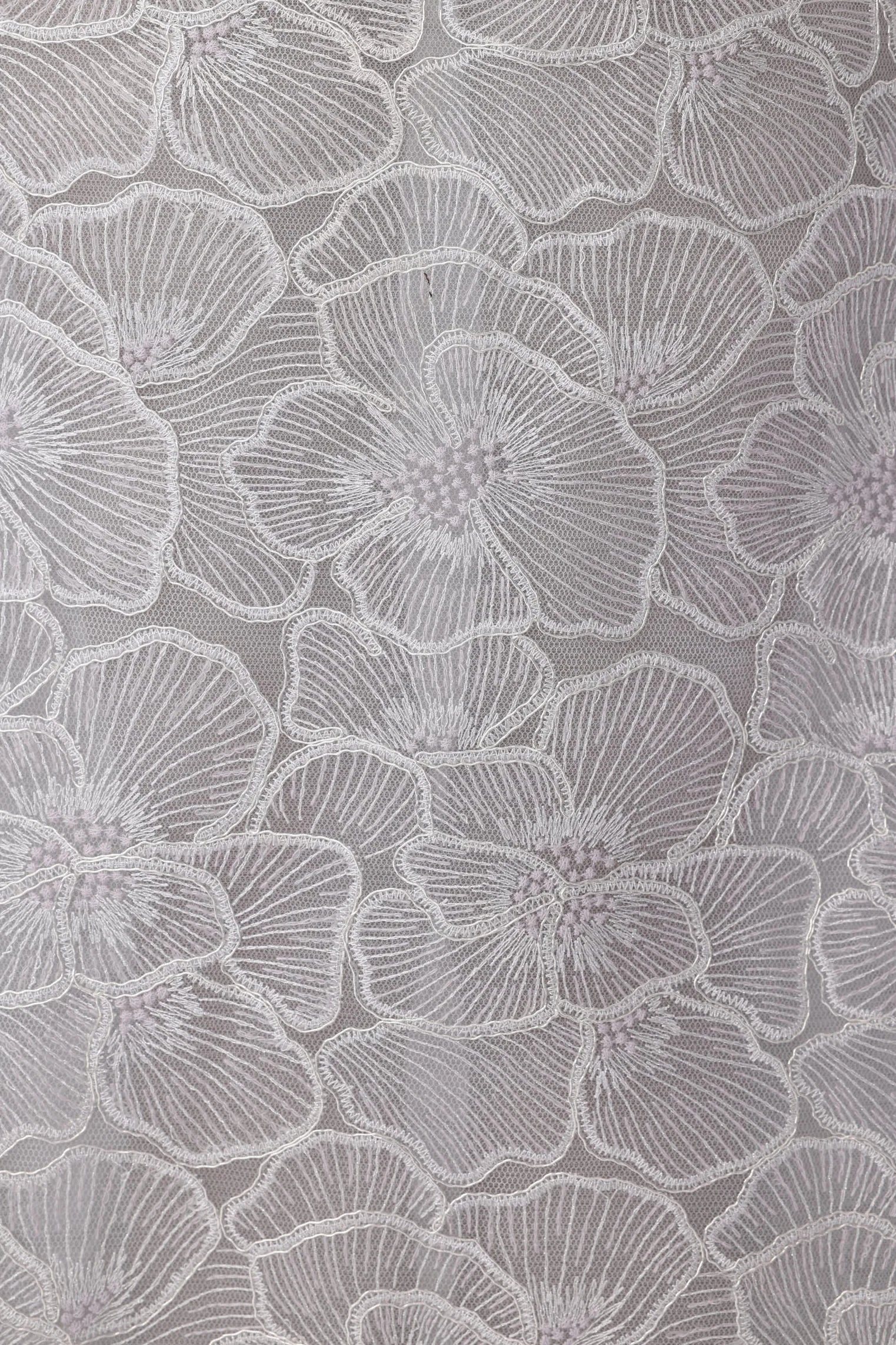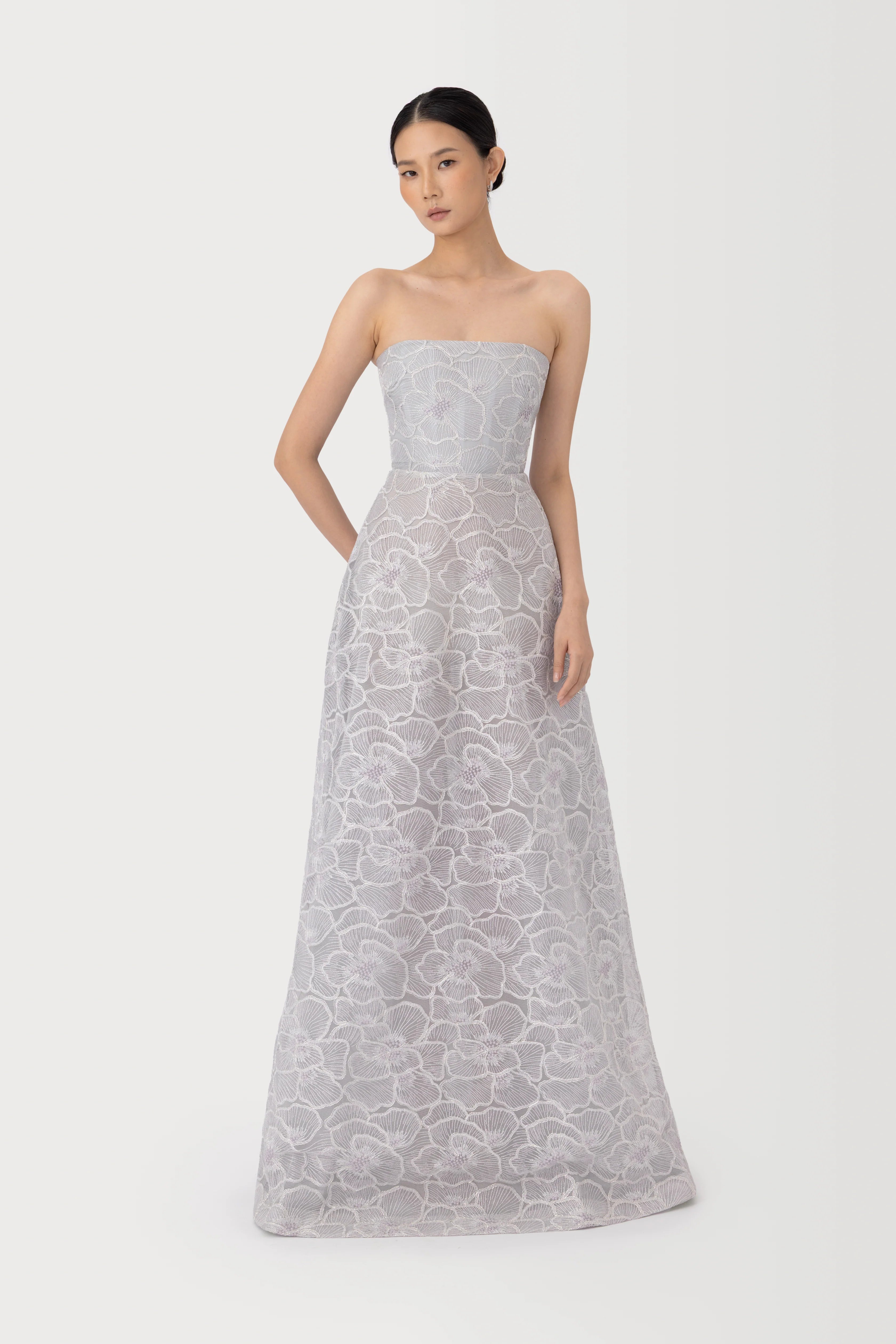 The Yvonne embroidered gown is a strapless design featuring all-over floral embroidery on mesh, enhanced with subtle silver metallic threading that glimmers with movement. The bodice is fitted at the waist, flowing into a classic fit-and-flare skirt in a floor-length silhouette.