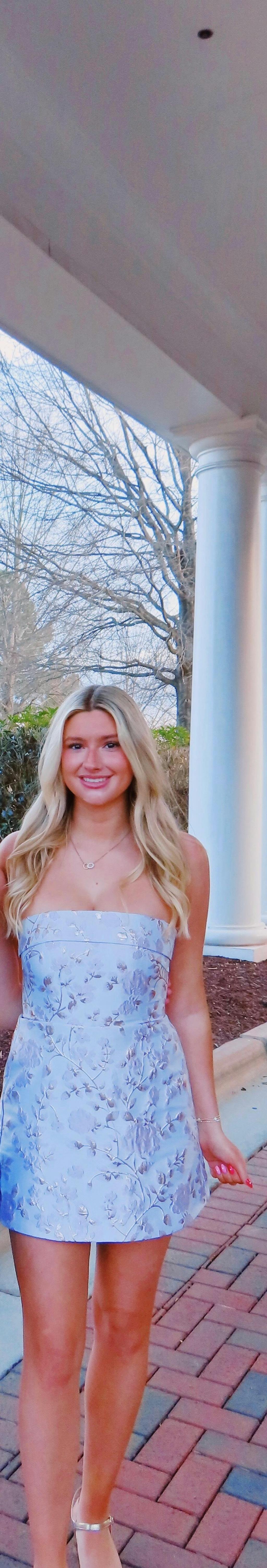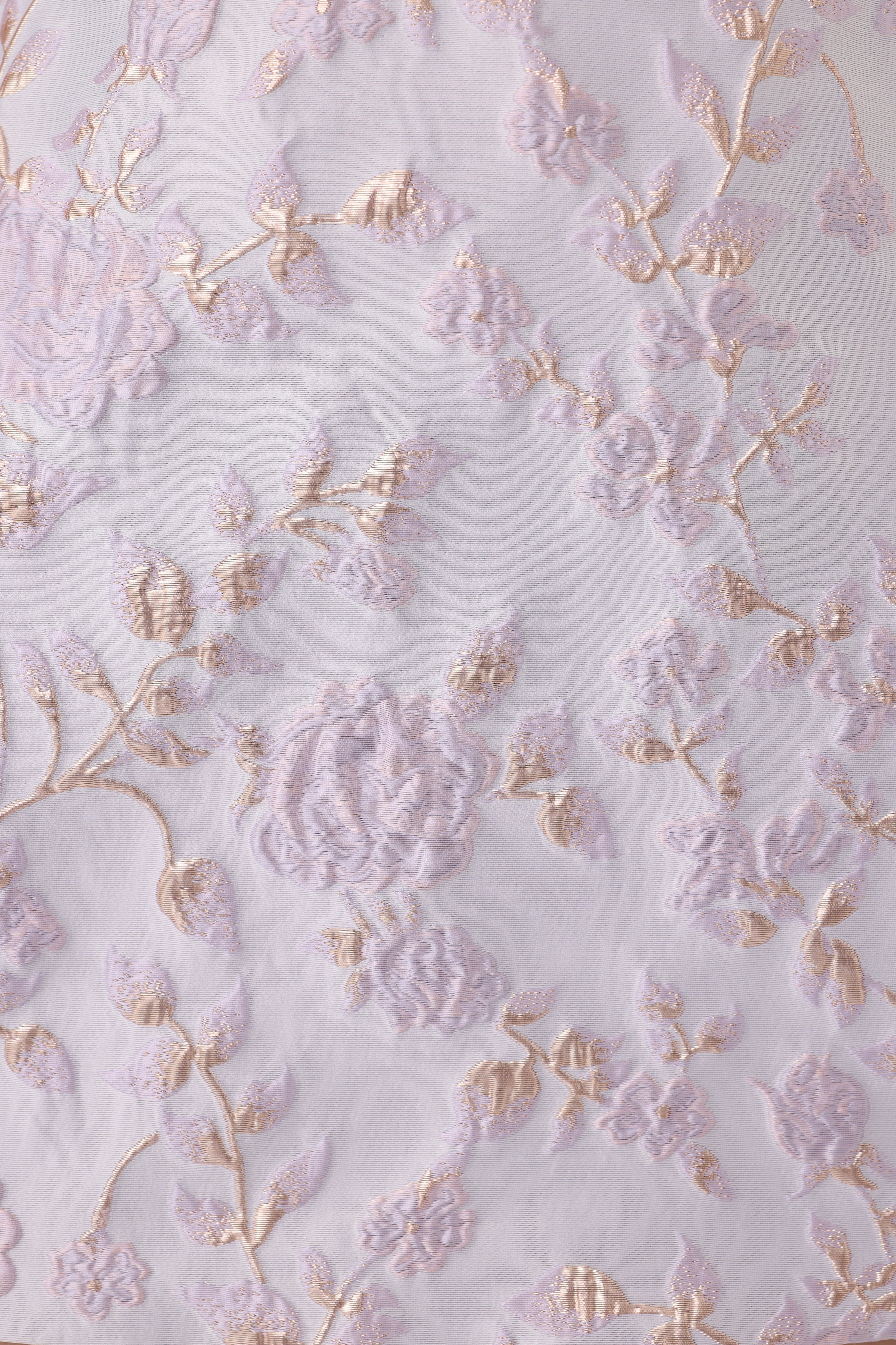 The Jodie dress is a strapless mini piece in floral jacquard with a hint of metallic. Its lilac floral pattern creates a fresh aesthetic, enhanced by a fold-over strapless neckline