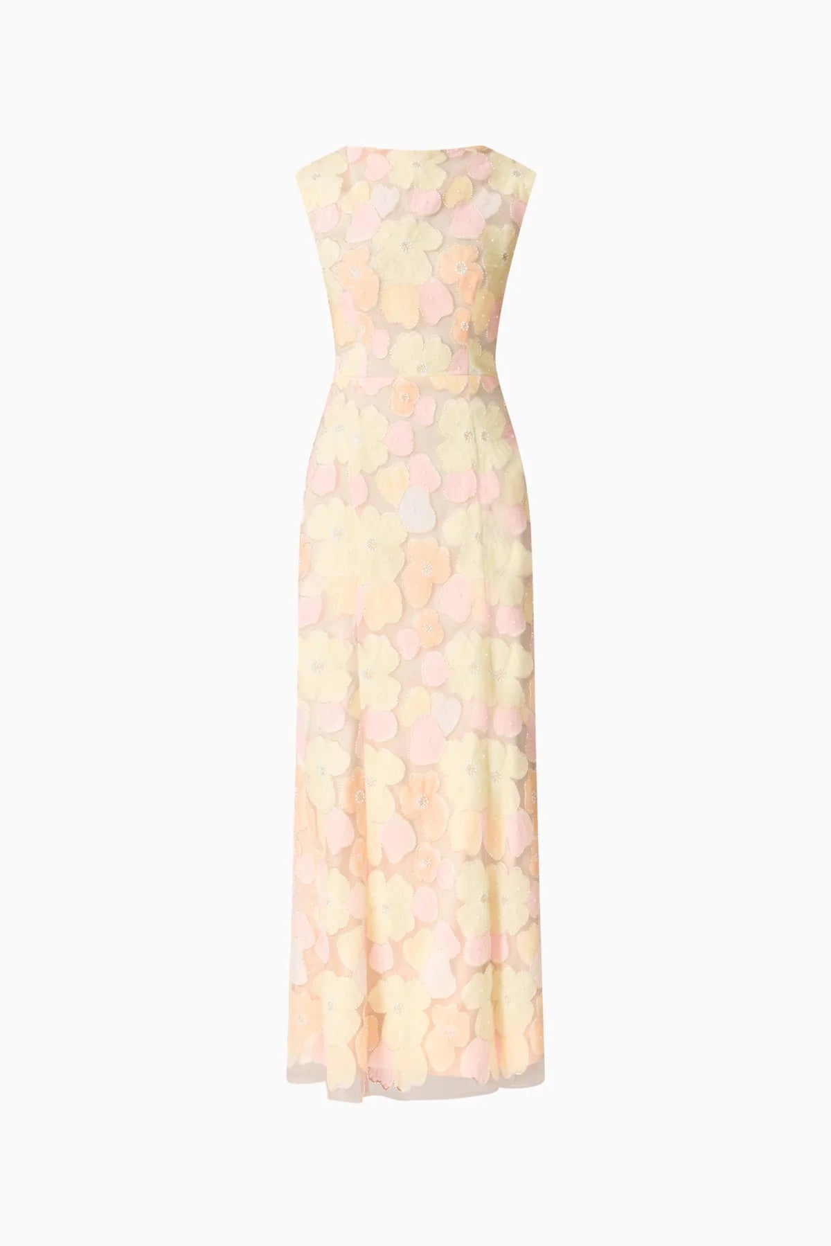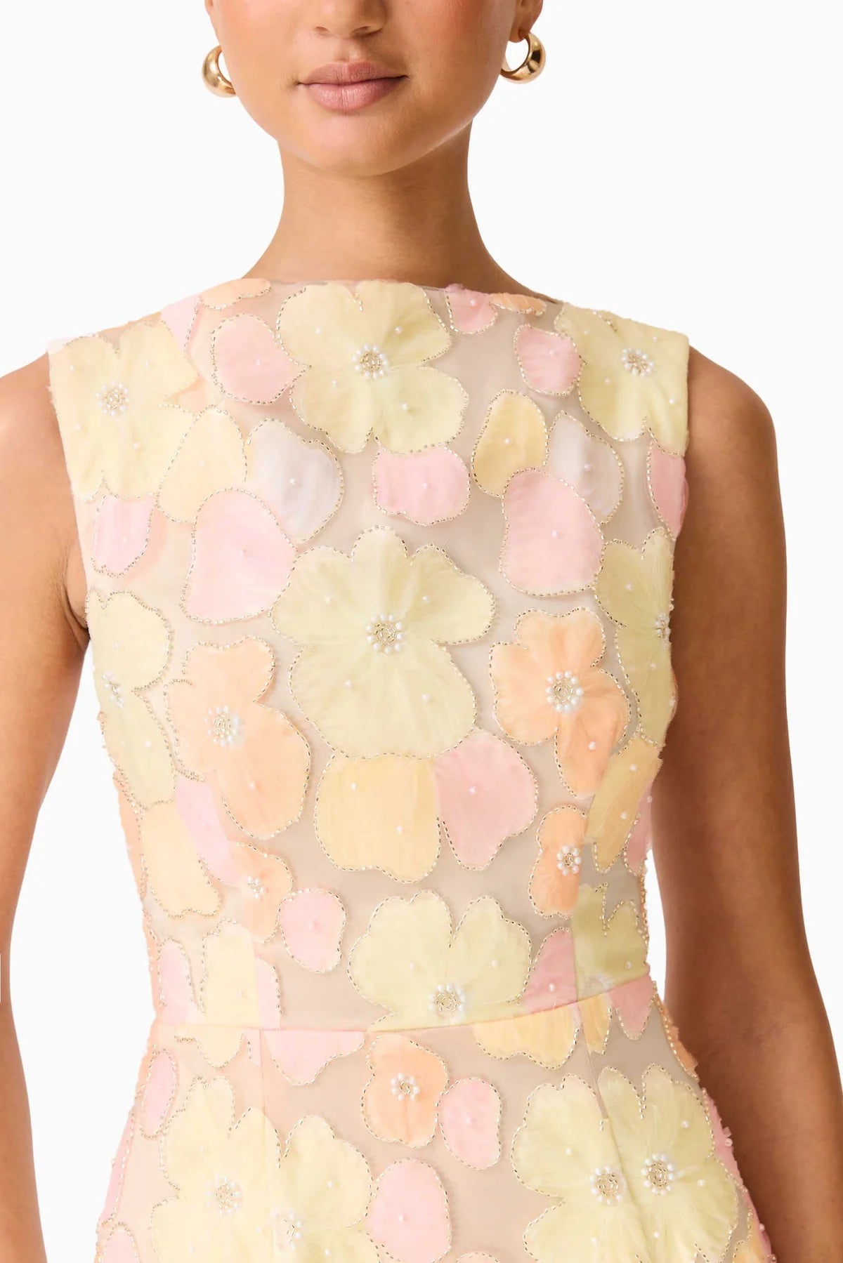 The Zaria Sleeveless Gown in a vibrant yellow floral print is a stunning choice for formal events or special occasions. With its elegant boat neckline, this gown offers a sophisticated and flattering silhouette. Crafted from embroidered mesh fabrication, the gown features intricate floral detailing that adds depth and texture to its design.
